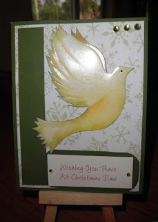 Another one of the cards that I have made for Christmas. I call it the Dove of Christmas. I used the dove from another card (recycled) and used it here. The background paper is from Color box and the sentiment are computer generated. I just added a strip of the base card.to the front for some color. I also added the rhinestones for bling.
